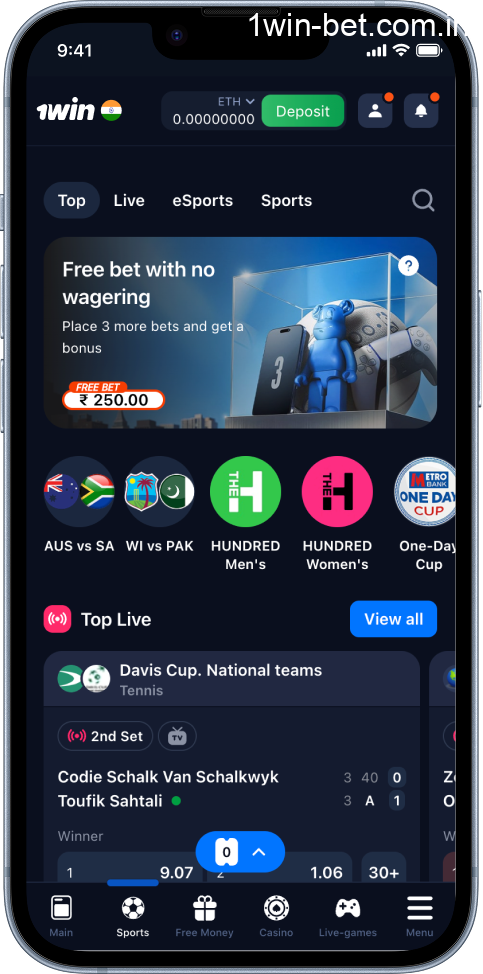 You can bet on sports right after installing the app. There are over 35 sports to pick from. The list includes cricket, kabaddi, football, and tennis, among others. Each tab shows upcoming matches, odds, and bet types. Top sports on 1win include: